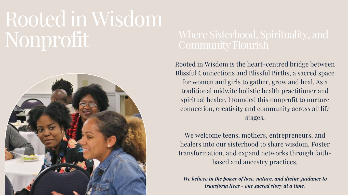 At Blissful Connections and Blissful Births, and our Nonprofit Rooted in Wisdom we serve as a beacon of guidance along life’s path, seamlessly intertwining faith, bliss and ancestral wisdom to nurture families, spark personal growth, and cultivate deep harmony with our bodies and nature.