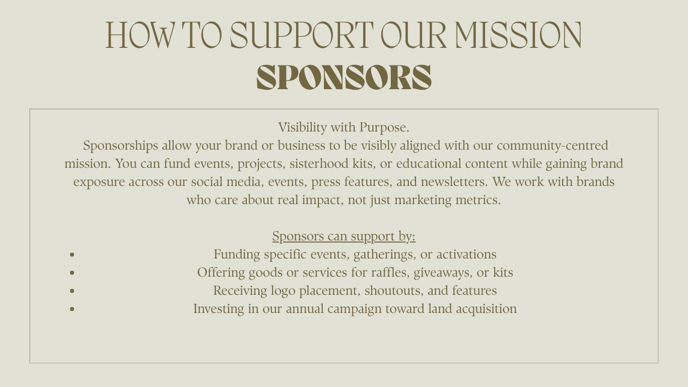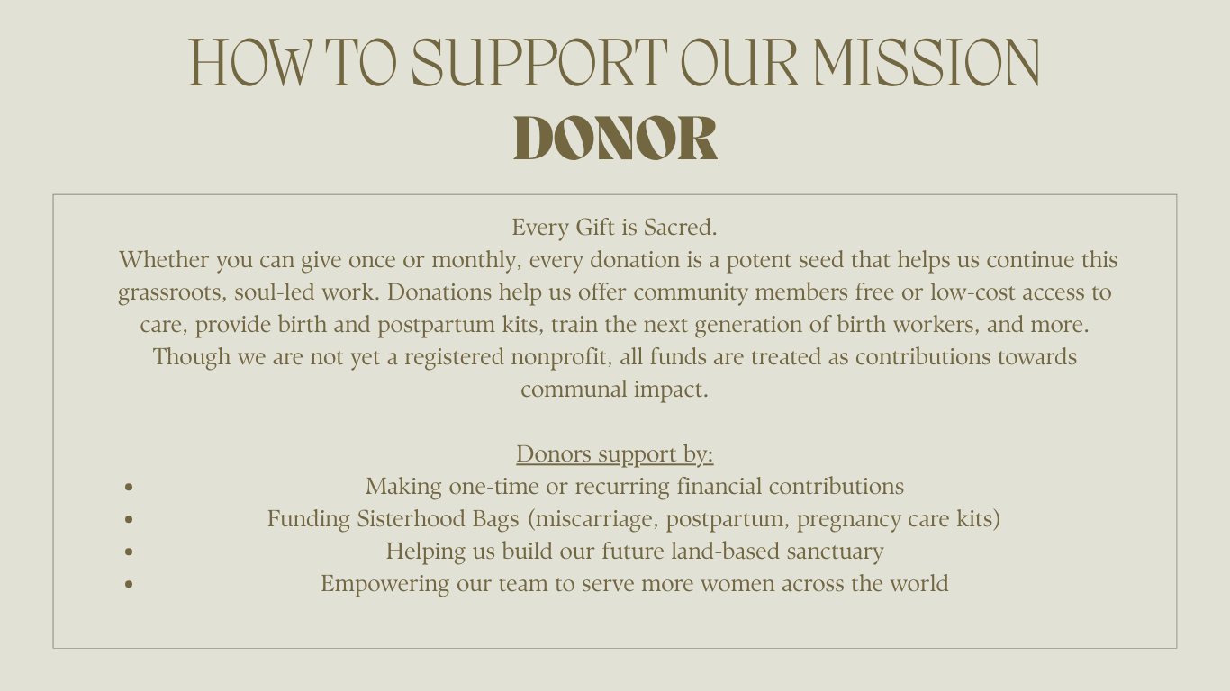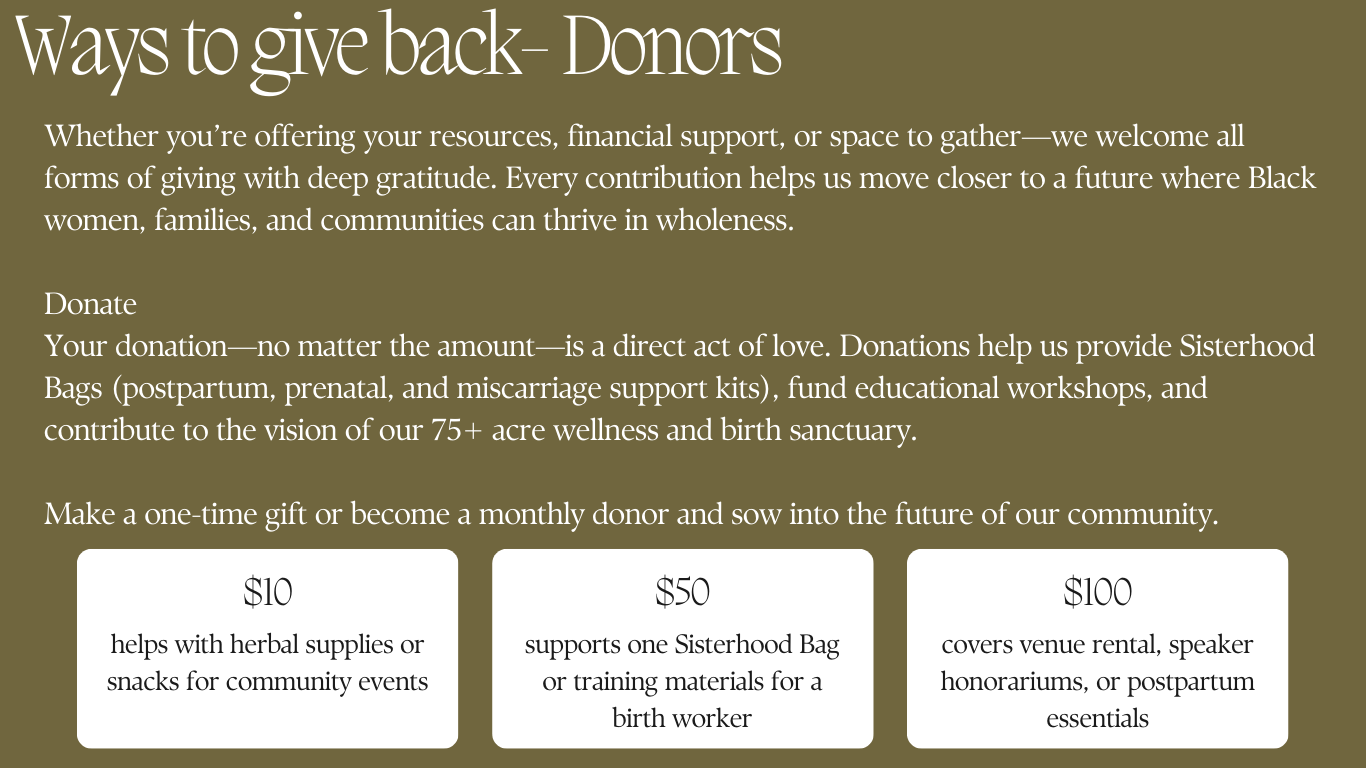 Your support is helping us grow into a self-sustained sanctuary—a 75+ acre space where we can farm, birth, host, educate, and restore. From providing sisterhood support bags to funding events and training birth workers, every offering is an act of communal care. With our first investment goal being $3 million dollars we are creating a safe, sustainable space for maternal care, birth education, traditional healing, and community-driven wellness.