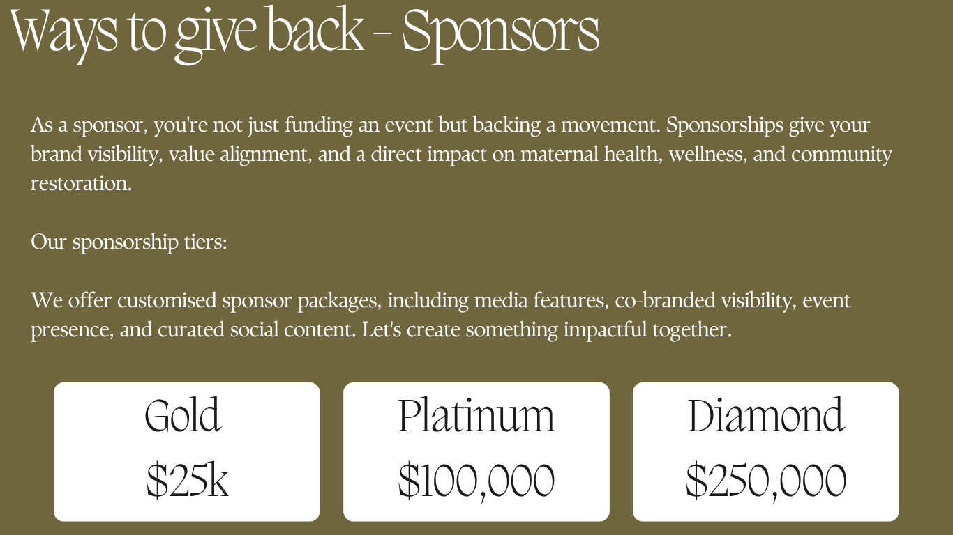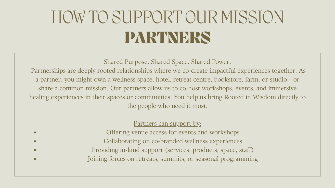 At Rooted in Wisdom, our mission is to reclaim ancestral knowledge, empower women and families through holistic wellness, and create safe, sacred spaces for healing, birth, and community. Whether you’re a visionary business, a generous donor, or a brand seeking meaningful impact—we invite you to walk alongside us in this powerful movement.